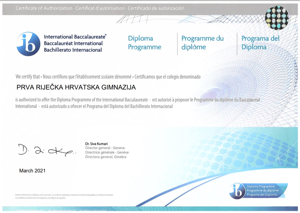 Prva riječka hrvatska gimnazija is an accredited school for the Diploma Programme. The school has been authorized as an IB World School. IB World Schools share a common philosophy- a commitment to high-quality, challenging, international education- that we believe is important for our students. Only schools authorized by the IB Organization can offer any of its four academic programmes: the Primary Years Programme (PYP), the Middle Years Programme (MYP), the Diploma Programme (DP), or the Career-related Programme (CP). For further information about the IB and its programmes visit http://www.ibo.org.
